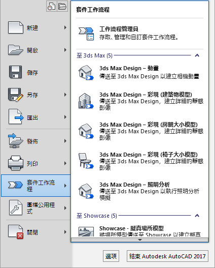 (僅限 AutoCAD Suites) 指定、複製或刪除準備圖面設定的工作流程,以開啟 Autodesk Showcase 或 Autodesk 3ds Max。