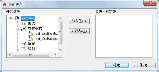 將「外部參考」清單中選取的具名物件定義移動到「要併入的定義」清單中。