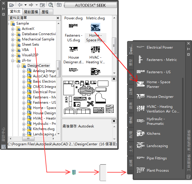 - 從設計中心拖曳圖面、圖塊與填充線。將加入到工具選項板中的圖面拖曳到另一個圖面時,這些圖面將做為圖塊插入。