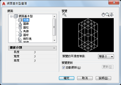 指定要修改的網面基本型。選取要在「鑲嵌分割」下顯示其設定的基本型類型 (例如「方塊」或「圓錐」)。