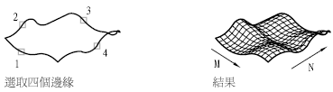 下圖中的網面是衍生自四個稱為「邊」的物件。邊可以是形成一個封閉迴路並共用端點的弧、直線、聚合線、雲形線或橢圓弧。昆氏嵌片是在四個邊之間內插而成的雙三次曲面 (一條曲線在 M 方向而另一條在 N 方向)。