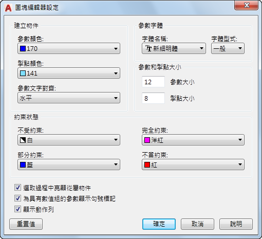 修改「圖塊編輯器」的色彩、文字、掣點、約束和其他顯示設定。