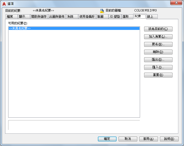 顯示「變更紀要」對話方塊,以變更所選紀要的名稱和說明。您要重新命名紀要,但仍要保留它的目前設定時,請用「更名」。
