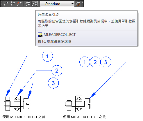 以圖塊做為內容的多重引線物件可收集並貼附至連字線。使用 MLEADERCOLLECT 可根據您的圖面需求,水平、垂直或在某指定區域內收集多重引線。