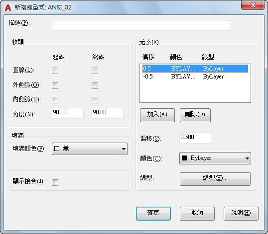 將新元素加入複線型式中。只有為除 Standard 以外的複線型式選取了顏色或線型後,才可使用此選項。