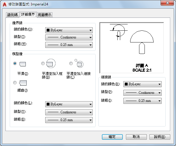 - 顯示圍繞詳圖的邊框,並設定顯示在詳圖中的模型切線為平滑。