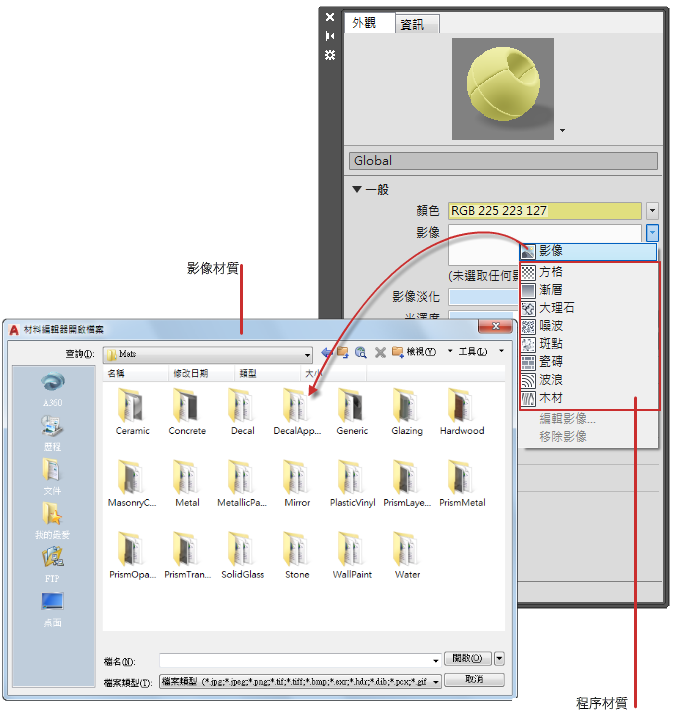 產品提供的影像的資源庫,您可以與材質一同使用。您也可以使用以下檔案類型加入自己的材質: