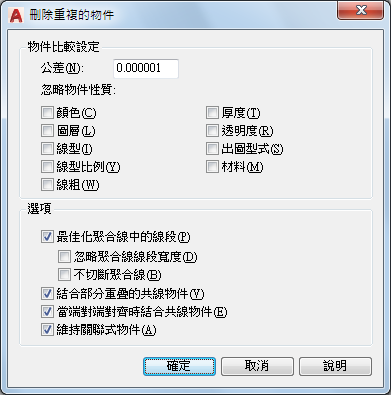 還有,OVERKILL 會比較個別的聚合線線段與完全獨立的線和弧線段。如果聚合線與線或弧物件重複,則其中之一會刪除。