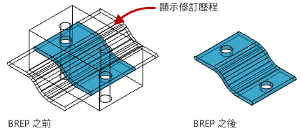 從實體移除建立該實體所用原始元件的歷程後,將無法再選取和修改原始元件。BREP 還會移除曲面關聯性。曲面遺失關聯性後,會遺失與建立曲面方法相關的所有數學表示式或資訊。