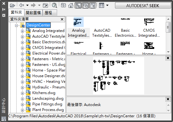使用左側的樹狀檢視可以瀏覽內容的來源,並於右側內容區域顯示內容。您可以使用內容區域將項目加入圖面或工具選項板。預覽或描述會針對選取的圖面、圖塊、填充線樣式或外部參考加以顯示。
