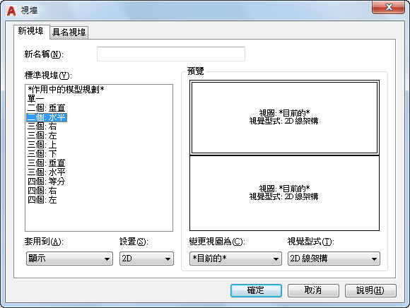 指定新模型空間視埠規劃的名稱。如果沒有輸入名稱,則會套用視埠規劃,但不儲存。如果視埠規劃沒有儲存,則無法在配置中使用它。