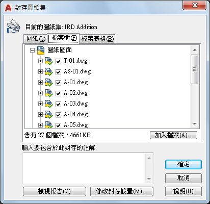使用階層式樹狀格式清單要併入封存套件中的檔案。依預設,目前圖面的所有相關檔案 (如相關的外部參考、出圖型式和字體) 都會列出。您可以將檔案加入封存套件,也可以移除既有的檔案。URL 所參考的相關檔案不會併入封存套件。