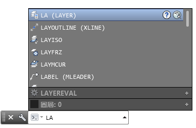 如果關閉自動完成功能,您可以在指令行鍵入一個字母,然後按 Tab 鍵循環顯示所有以該字母為開頭的指令與系統變數。按 Enter 或空格鍵可啟動指令或系統變數。