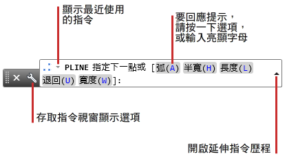 可停靠且可調整大小的指令視窗接受指令及系統變數,並顯示提示來協助您完成指令序列 (包括在另一個位置啟動的指令,例如功能區)。