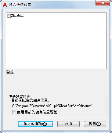 從指定的圖紙集資料檔匯入已選取的傳送設置。
