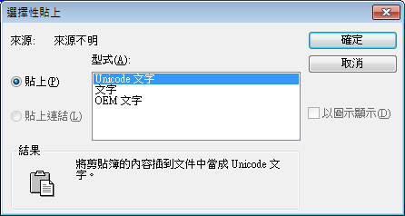 顯示將剪貼簿的內容貼到目前圖面時,所能使用的各種格式。