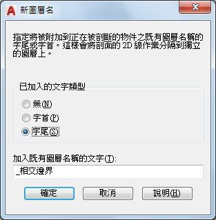 指定是否向剖面圖塊元件的圖層名稱加入識別文字,或指定加入識別文字的方式。