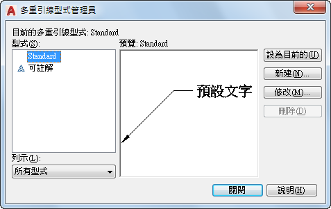 設定在「型式」清單中選取的型式做為目前的型式。所有新多重引線都是使用此型式所建立。