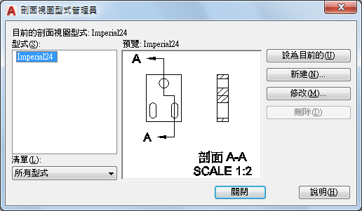 將在「型式」清單中所選的剖面視圖型式設定為目前型式。所有新剖面視圖都是使用此剖面視圖型式所建立。