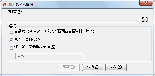 新圖面加入資料夾時,將其包含至資料萃取。加入新圖面時,會顯示「找到新圖面」對話方塊。選取此選項後,指定的資料夾為「動態」。未選取此選項時,資料夾為「靜態」。