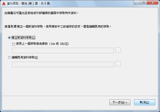 使用上一次儲存在資料萃取 (DXE) 檔或屬性萃取樣板 (BLK) 檔中的設定。當您執行精靈時,每個頁面均已使用樣板檔中的設定填充。您可以變更這些設定。按一下「...」按鈕以在標準檔案選取對話方塊中選取檔案。