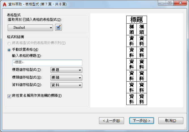 可手動輸入標題以及標題、標頭和資料儲存格型式的規格。