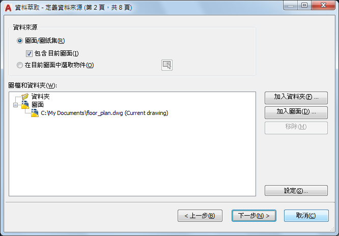 指定圖檔,其中包含要從中萃取資料的資料夾。可讓您選取要從中萃取資訊之目前圖面中的物件。