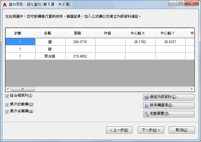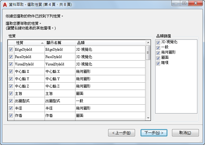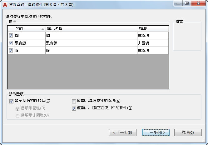 指定物件類型 (圖塊和非圖塊) 以及要萃取的圖面資訊。