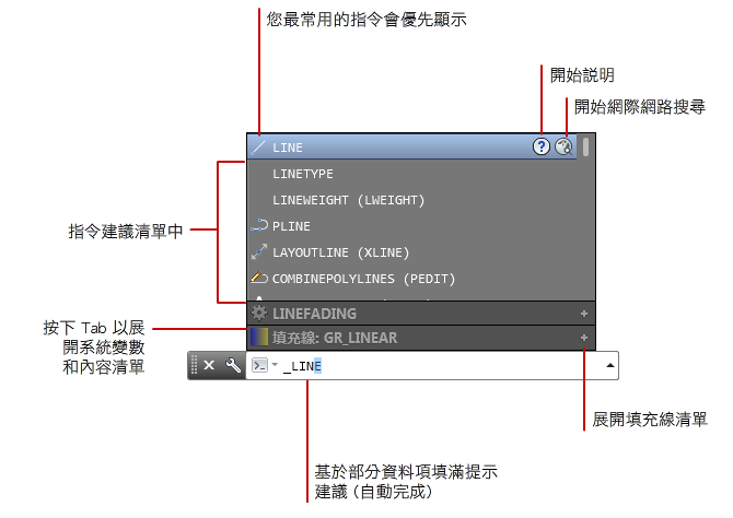 當您在指令視窗中或是動態輸入方塊中輸入指令的前幾個字母時,建議的指令清單會隨即顯示。依預設,清單具有以下特性: