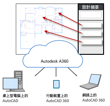 「設計摘要」選項板提供在圖面中加入註解和影像的方法,您可以透過 Autodesk A360 與同事、客戶和顧問在線上進行共用。