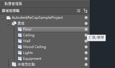 按一下「點雲」頁籤 「選項」面板 「點雲管理員」。 查找