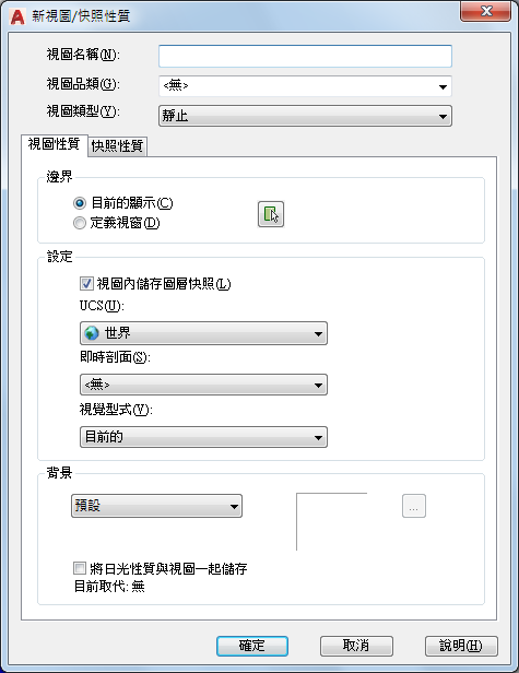 暫時關閉「新視圖」和「視圖管理員」對話方塊,以便您使用指向設備定義「新視圖」視窗的對角點。
