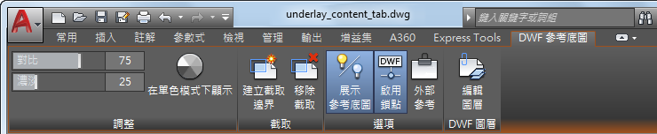 選取圖面中的 DWF 參考底圖時,功能區上會顯示「DWF 參考底圖」關聯式頁籤。