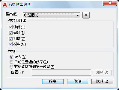 在匯出的 FBX 檔中嵌入材質。