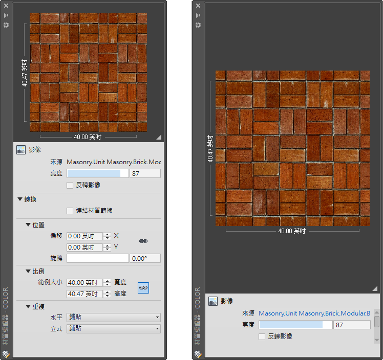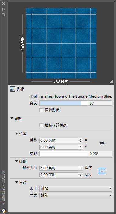 若要套用「位置」、「比例」和「重複」性質所作的變更目前的材質,以其他材質在相同的材料,請選取「連結材質轉換」。