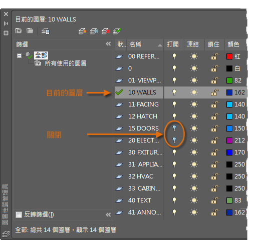 在標示「開啟」的欄之中,請注意兩個圖層的「燈泡」圖示是暗的。這些圖層已經關閉以隱藏樓板平面圖中的門和電線。