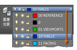 如圖所示,圖層 10 WALLS 是目前圖層。所有新物件都會自動放置在該圖層上。圖層的清單中,10 WALLS 旁的綠色勾選會確認其為目前的圖層。