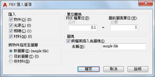 指定要匯入的內容、如何為匯入的物件指定圖層、轉換單位以及是否將 FBX 檔匯入為圖塊。