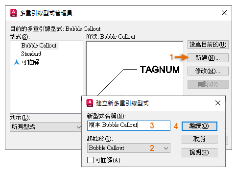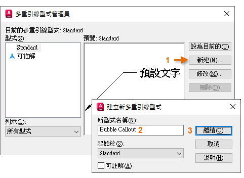 - 在「多重引線型式管理員」中,按一下「新建」(1),輸入「標示圈圖說」做為新的型式名稱 (2),然後按一下「繼續」(3)。