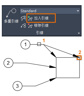- 按一下「加入引線」工具,然後選取頂端的多重引線 (1)。在矩形上指定另一個點 (2)。