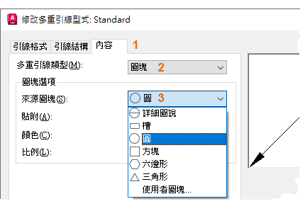 - 接下來,按一下「內容」頁籤 (1),將多重引線類型從「多行文字」變更為「圖塊」(2)。對「來源圖塊」,選擇「圓」(3)。然後按一下「確定」。
