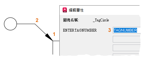 - 使用「端點」物件鎖點,按一下矩形的角點以指定箭頭位置 (1)。然後按一下引線連字線的位置 (2),在「編輯屬性」對話方塊中輸入一個字母或數字 (3),然後按一下「確定」。