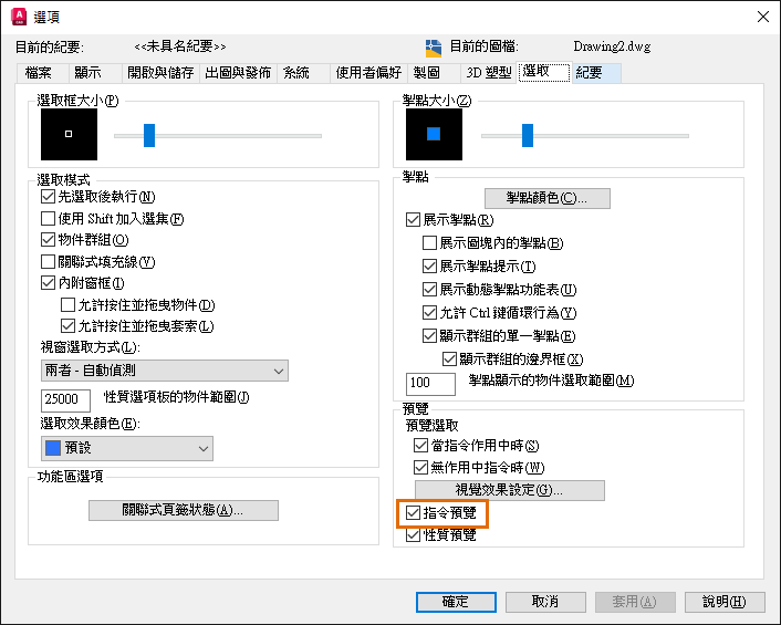 | COMMANDPREVIEW | 控制是否顯示某些指令可能的結果預覽。 | 1 | 登錄 |