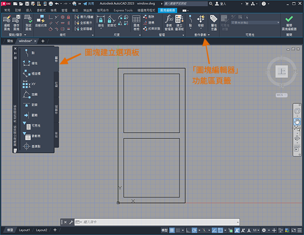 此時會開啟「圖塊編輯器」環境,並且顯示「圖塊編輯器」功能區頁籤。