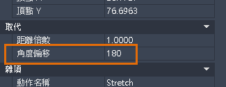 - 在「性質」選項板上將「角度偏移」設定為 180。這會讓選取的物件以您拖曳線性掣點時相反的方向拉伸。