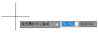 AutoCAD 會提示您輸入表示圓中心點的座標值。此時會顯示三個工具提示,焦點設定為表示 X 座標值的第二個工具提示。 |
