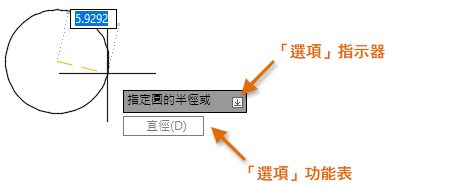 此圖示指出有其他可用的選項。當系統提示您輸入半徑時,請按一下向下箭頭或按向下鍵,會顯示一個有「直徑」選項的功能表。選擇「直徑」可讓您指定圓的直徑而非半徑值。功能表顯示時,您可以按向下鍵和向上鍵或指向設備,在可用的選項中移動。