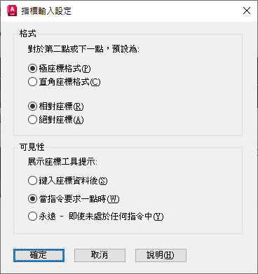 在「指標輸入設定」對話方塊中,您可以控制使用「動態輸入」時,需要輸入第二點或下一點的格式。預設格式設定為:「極座標格式」和「相對座標」。設定為「相對座標」可讓您在輸入指令的第二個或下一個座標值之前,不必輸入 @ 符號。