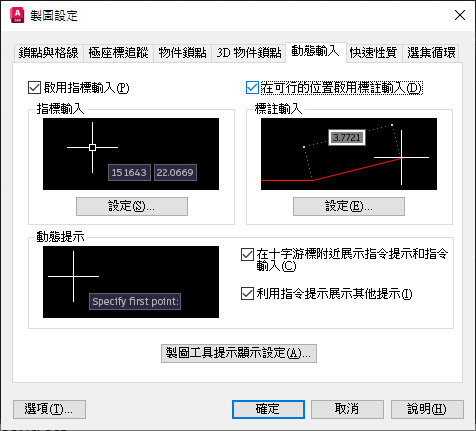 以下提供「製圖設定」對話方塊的「動態輸入」頁籤上的設定概述: