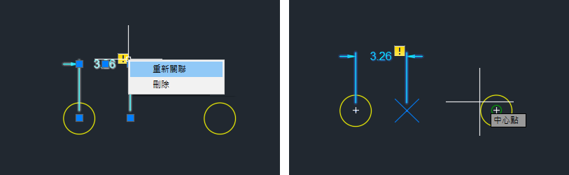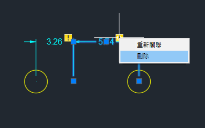 由於設計改變了,我們現在有兩個取消關聯的標註。為了修正,我們將刪除不再需要的標註,並將其他標註重新關聯至剩餘的圓。